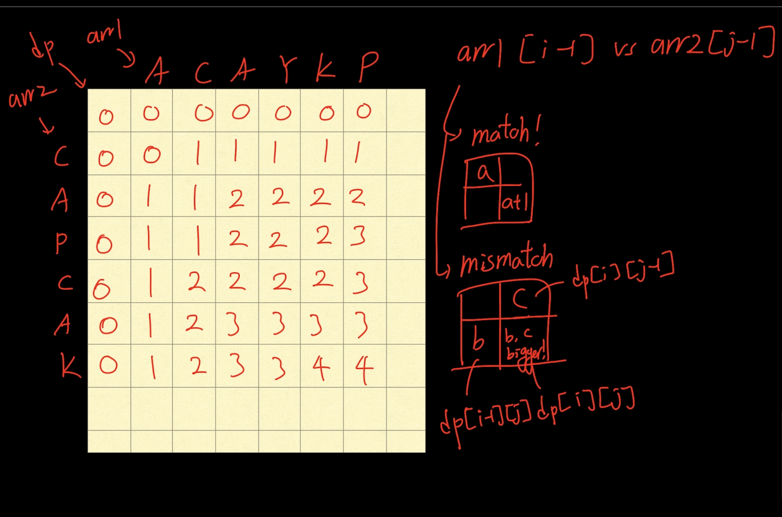 만약 arr1[i-1]과 arr2[j-1]이 같다면 ->dp의 i-1, j-1의 숫자에 1을 추가한 숫자를 dp의 i, j에 넣어줌